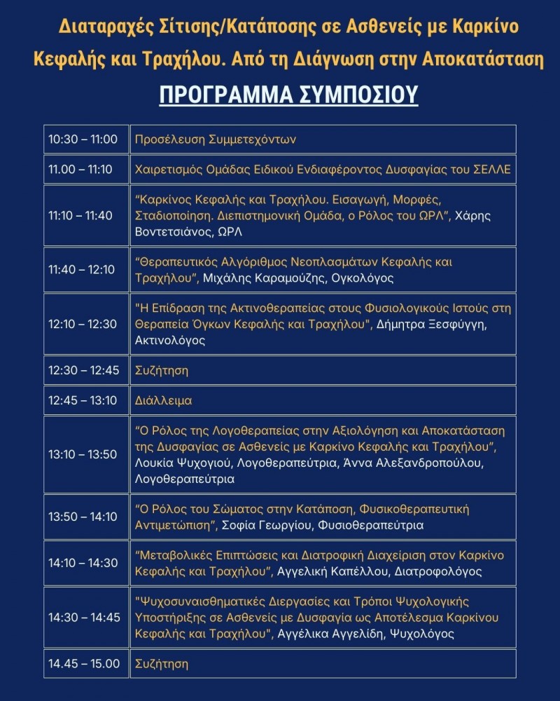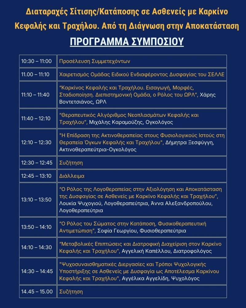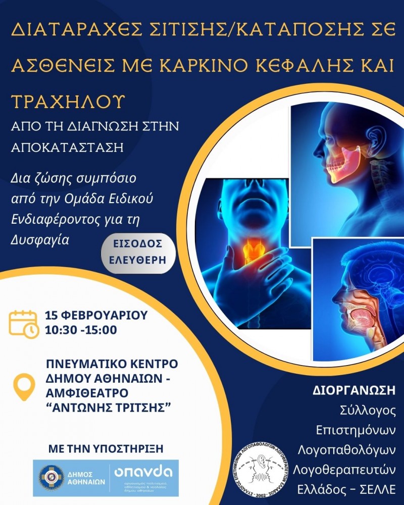 Η Ομάδα Ειδικού Ενδιαφέροντος του ΣΕΛΛΕ για τη Δυσφαγία διοργανώνει Δια ζώσης Συμπόσιο με θέμα "Διαταραχές Σίτισης/Κατάποσης σε Ασθενείς με Καρκίνο Κεφαλής και Τραχήλου. Από τη Διάγνωση στην Αποκατάσταση". Το συμπόσιο θα πραγματοποιηθεί 15 Φεβρουαρίου 2026 στο Πνευματικό Κέντρο Δήμου Αθηναίων - Αμφιθέατρο "Αντώνης Τρίτσης", Ακαδημίας 50 στην Αθήνα (άμεση πρόσβαση από τη στάση ΜΕΤΡΟ "ΠΑΝΕΠΙΣΤΗΜΙΟ". Κεντρική είσοδο από οδό Ακαδημίας. Είσοδο για Α.με.Α από την οδό Σόλωνος).