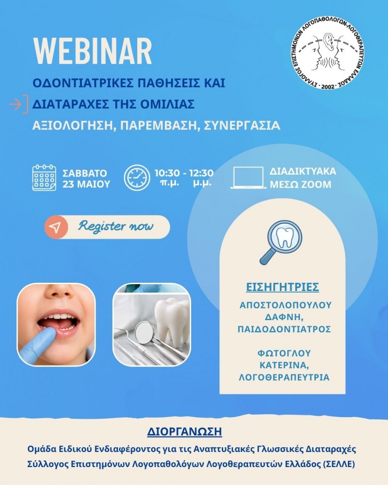 Η Ομάδα Ειδικού Ενδιαφέροντος για τις Αναπτυξιακές Γλωσσικές Διαταραχές διοργανώνει webinar με θέμα: "Οδοντιατρικές παθήσεις και διαταραχές της ομιλίας. Αξιολόγηση, Παρέμβαση, Συνεργασία" το Σάββατο 23 Μάϊου, 10:30πμ-12:30μμ, μέσω της πλατφόρμας ZOOM.