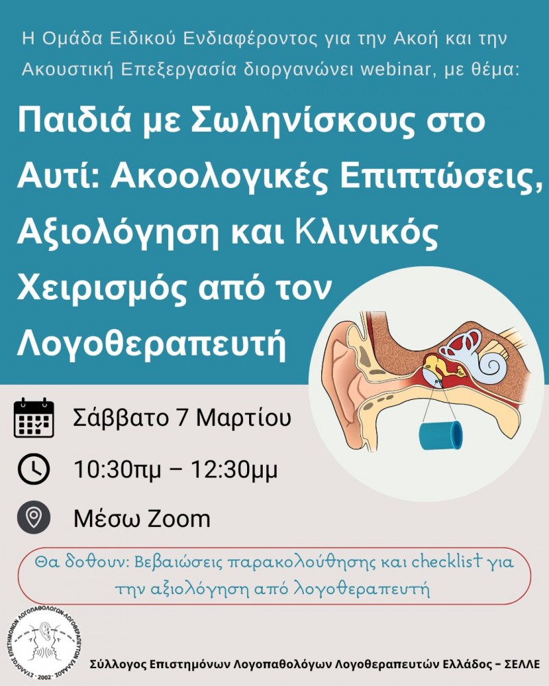 Η Ομάδα Ειδικού Ενδιαφέροντος για την Ακοή και την Ακουστική Επεξεργασία διοργανώνει webinar με θέμα: "Παιδιά με σωληνίσκους στο αυτί: Ακοολογικές Επιπτώσεις, Αξιολόγηση & Κλινικός Χειρισμός από τον Λογοθεραπευτή", το Σάββατο 7 Μαρτίου 2026, 10:30πμ-12:30μμ, μέσω της πλατφόρμας ZOOM.